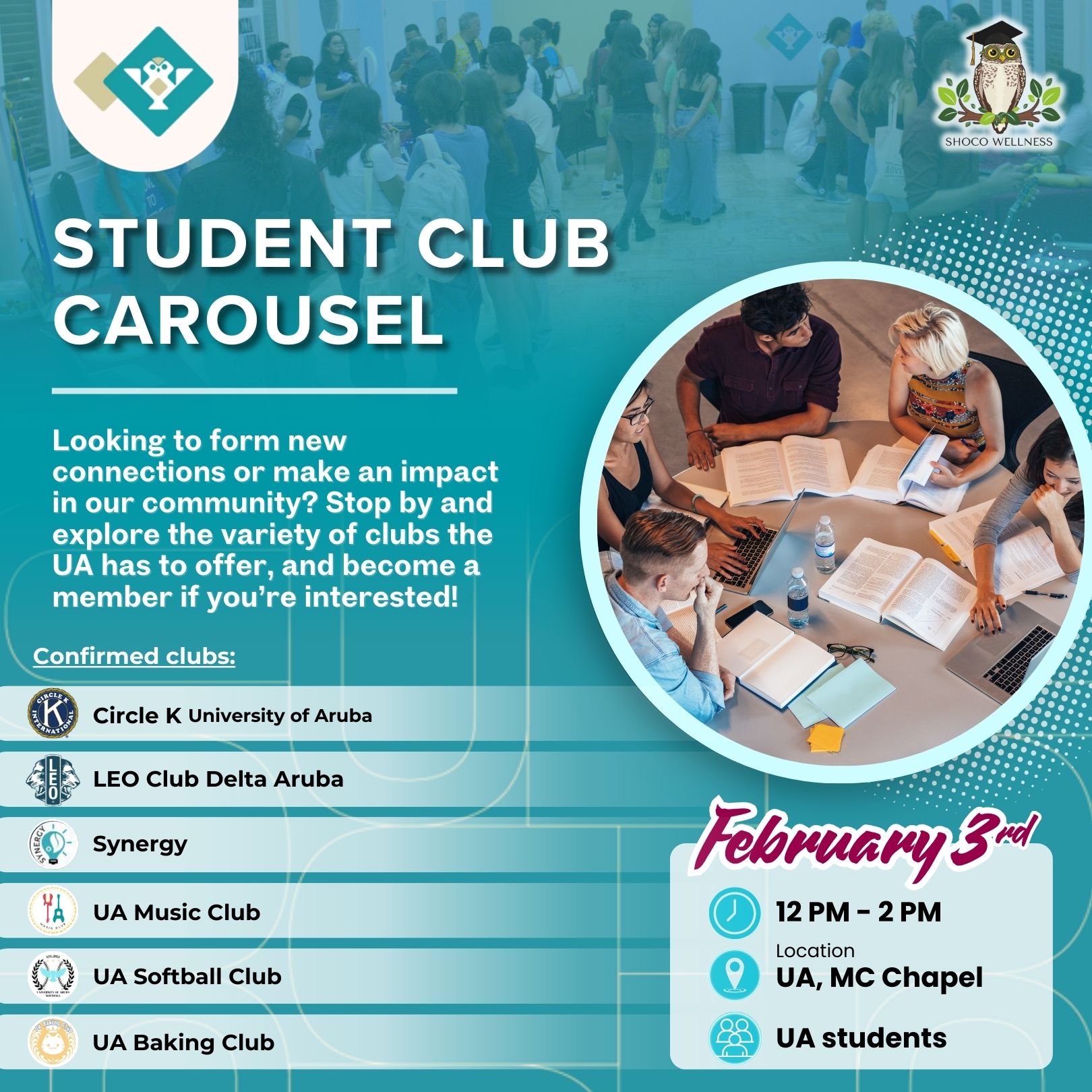 All students are welcome to stop by and explore all the variety of clubs the University of Aruba has to offer and become a new member if you’re interested—no need to sign up for the event, just pass by and check them out.